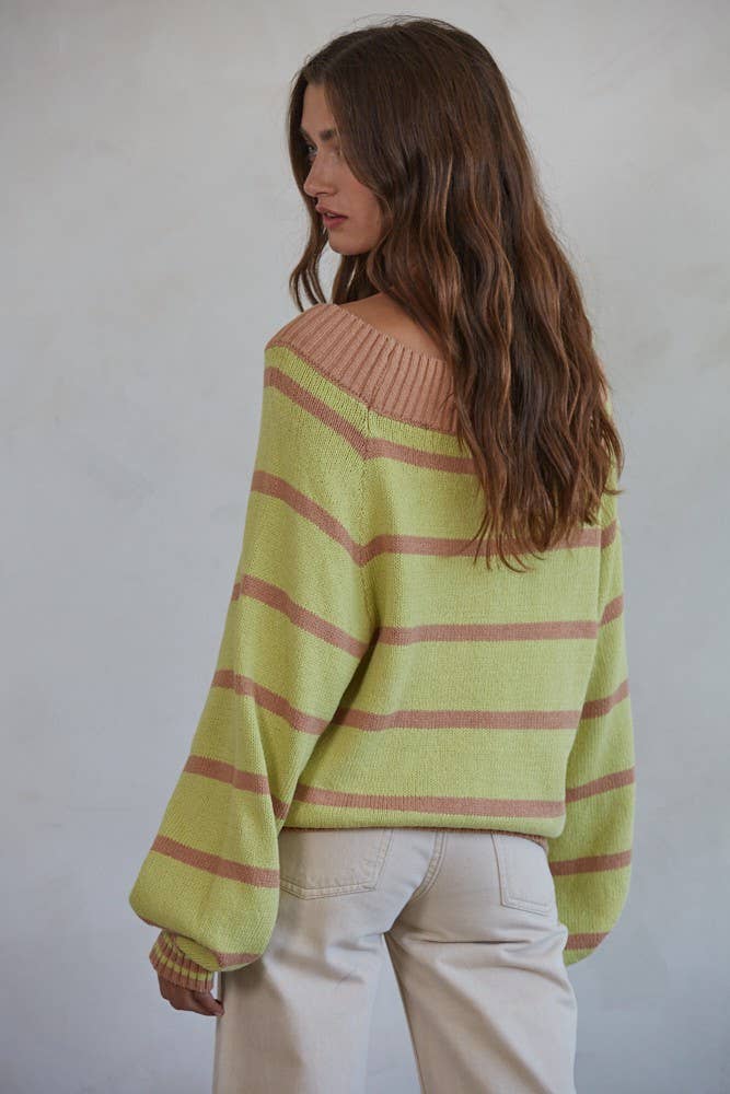 W1432 | Knit Sweater Striped Open Off Shoulder Top: Lime Mocha / M